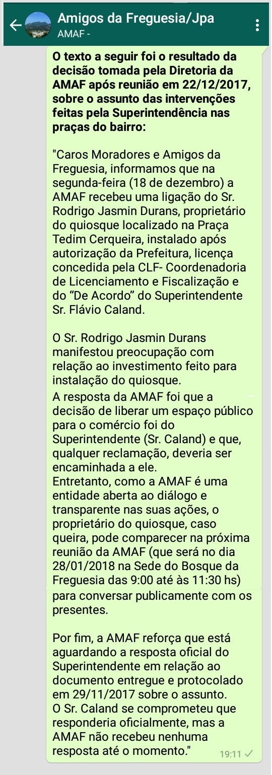 Ontem 26/12/2017 a Diretoria da AMAF divulgou uma mensagem no Grupo de Amigos da Freguesia no Whatsapp esclarecendo a situação gerada pelo contato telefônico feito pelo dono do quiosque em 18/12/2017.
