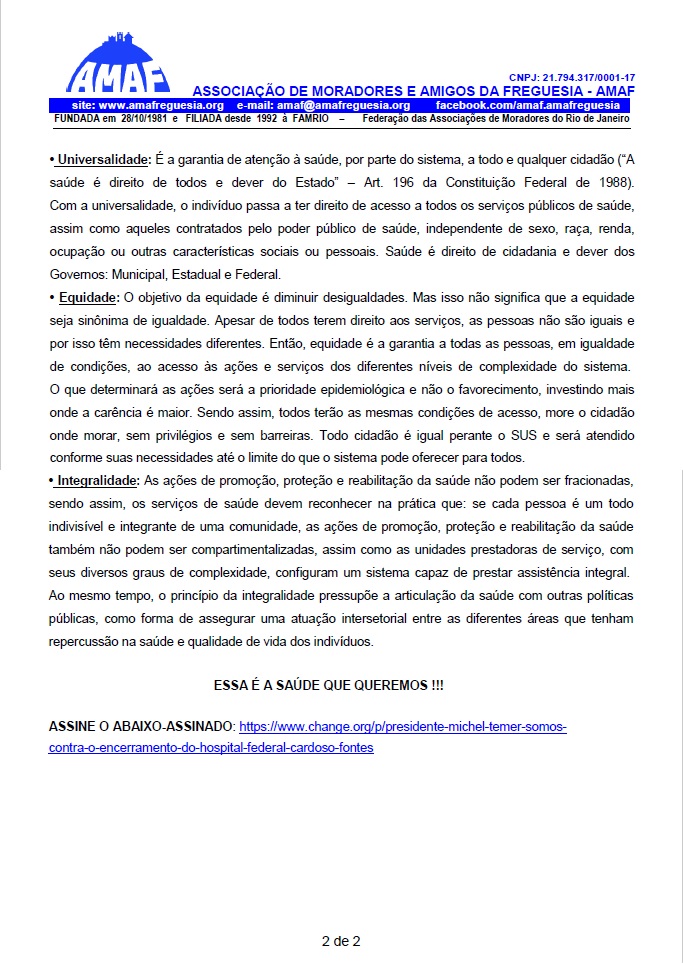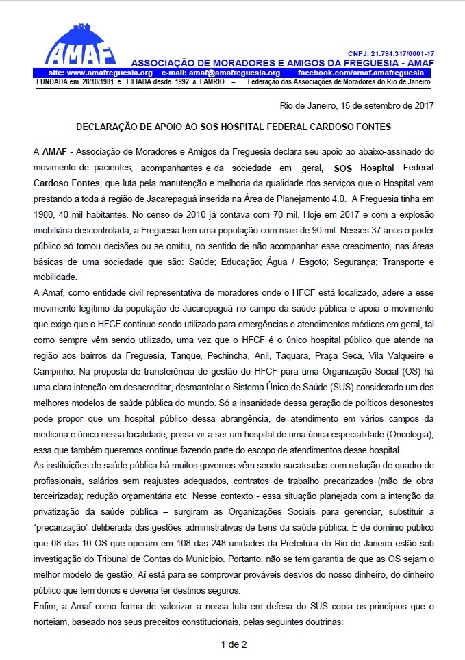 Abaixo segue a Declaração de Apoio da AMAF ao Abaixo-assinado do SOS HFCF em defesa do nosso Hospital. Clique na imagem para baixar o PDF da Declaração.