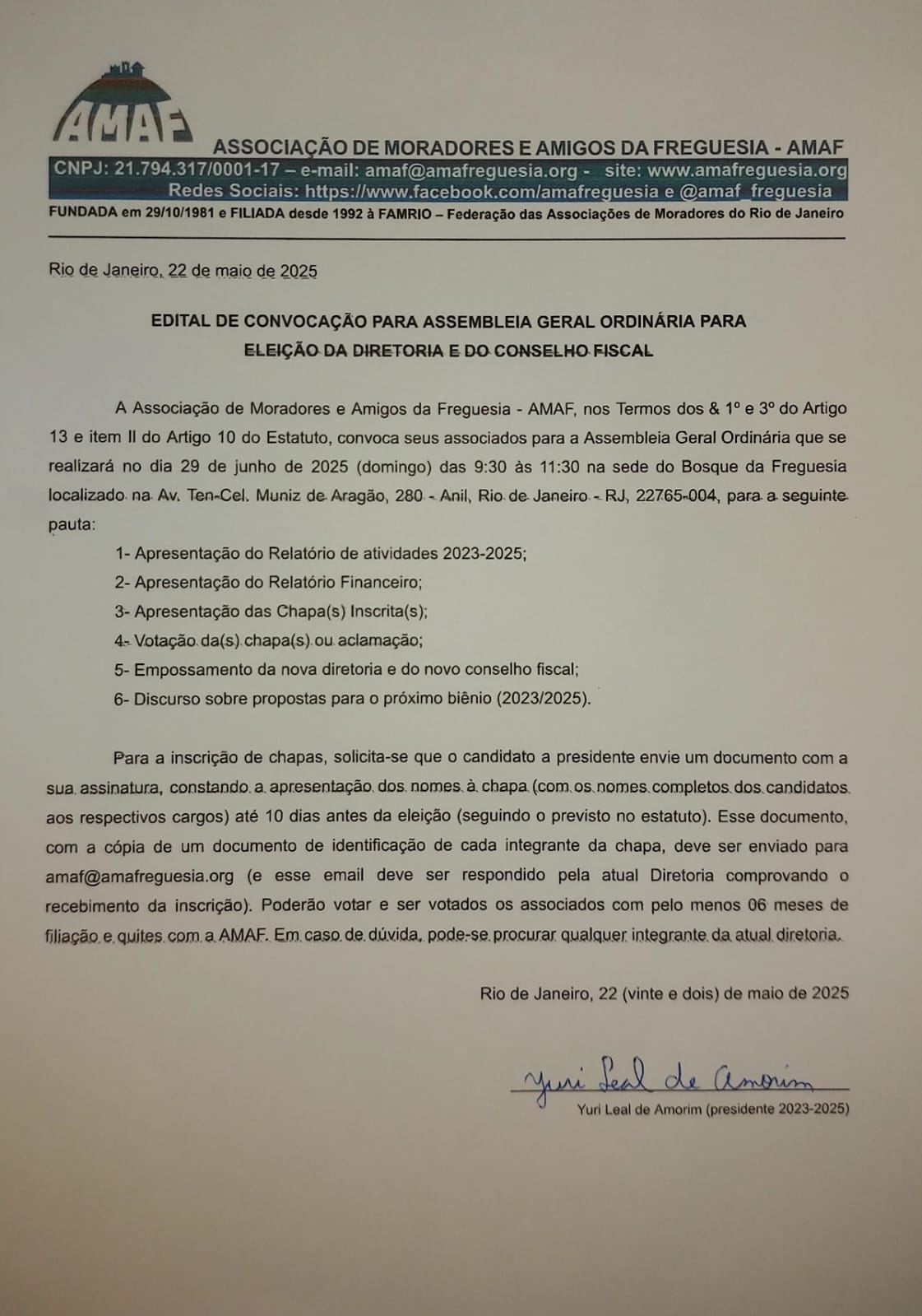 A Associação de Moradores e Amigos da Freguesia – AMAF, nos Termos dos & 1º e 3º do Artigo 13 e item Il do Artigo 10 do Estatuto, convoca seus associados para a Assembleia Geral Ordinária que se realizará no dia 29 de junho de 2025 (domingo) das 9:30 às 11:30 na sede do Bosque da Freguesia localizado na Av. Ten-Cel. Muniz de Aragão, 280 – Anil, Rio de Janeiro – RJ, 22765-004, para a seguinte pauta: