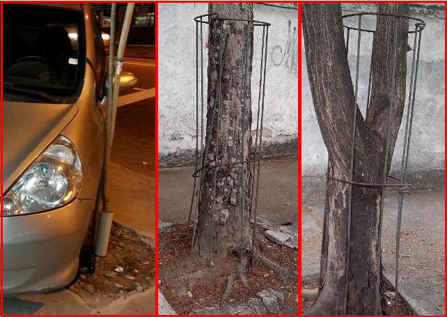 As fotos mostram essa realidade do carro na Três Rios e as proteções das mudas, hoje já crescidas, na rua São Ricardo.