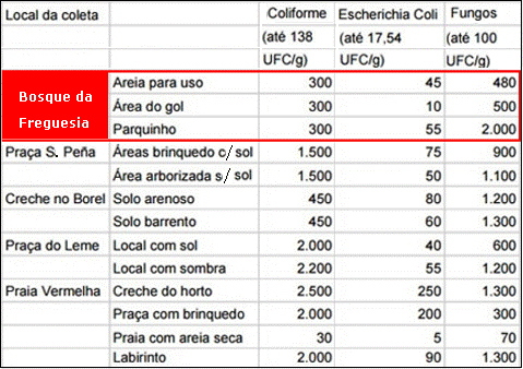 parasitas e fungos, apenas em dois dos 15 locais analisados não apresentam risco para a saúde.