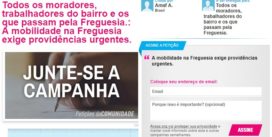 Você acha que a mobilidade na Freguesia é boa? Você não mora mas presta serviços no bairro? Você tem amigos e/ou parentes na Freguesia? Você acha que as autoridades atendem seu pedido com relação à mobilidade? Você acha que as autoridades dialogam com você para procurar a melhor solução para os problemas de mobilidade? Você acha que as autoridades quando fazem intervenções na sua rua, no seu bairro, etc. lhe perguntam antes se é isso … Continue lendo Participe do abaixo-assinado para solucionar o problema da MOBILIDADE na Freguesia!