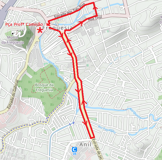 Roteiro: Pça Profª Camisão; Estr de Jacarepaguá (até esquina da Estr do Eng D’Água); retorno pela Estr de Jacarepaguá; R Tirol; R Comte Rubens Silva; Estr dos Três Rios; e Pça Profª Camisão.