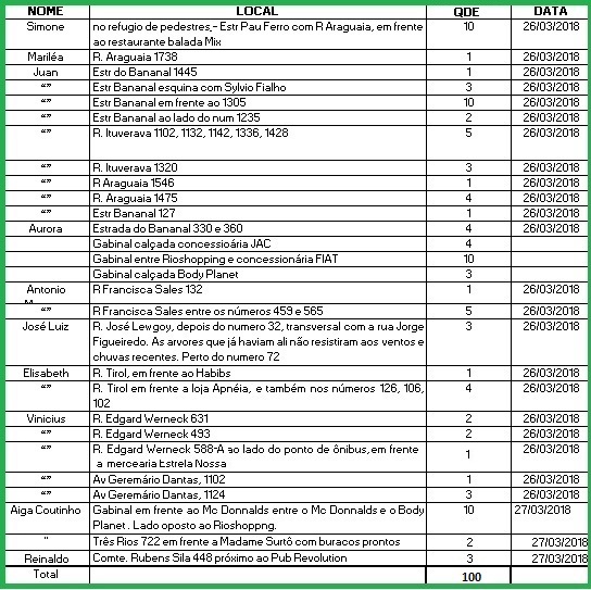 Completamos a lista de locais onde os moradores desejam que a FPJ plante as 180 árvores, que a Calper deve doar atendendo à norma prevista no artigo 14 do Decreto 38.058/13. O total de locais ultrapassou a quantidade solicitada, foram 493 árvores !