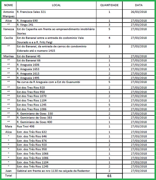 A AMAF agradece a todos os moradores que se empenharam em sugerir os locais e principalmente à Marise que recebeu as sugestões e as colocou num arquivo (primeira tabela) organizado por ruas.