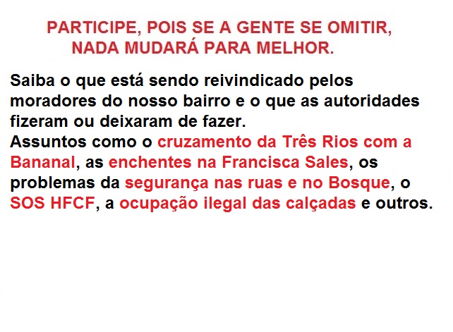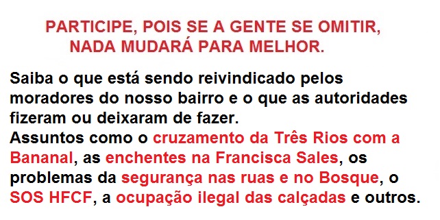É muito importante que todos os moradores e movimentos sociais do nosso bairro participem das reuniões da associação, que de forma rotineira e aberta, oferece a oportunidade de discutir os assuntos que afligem não só os moradores, como também aqueles que transitam pelo bairro ou são visitantes.