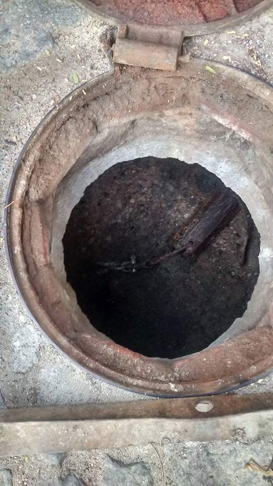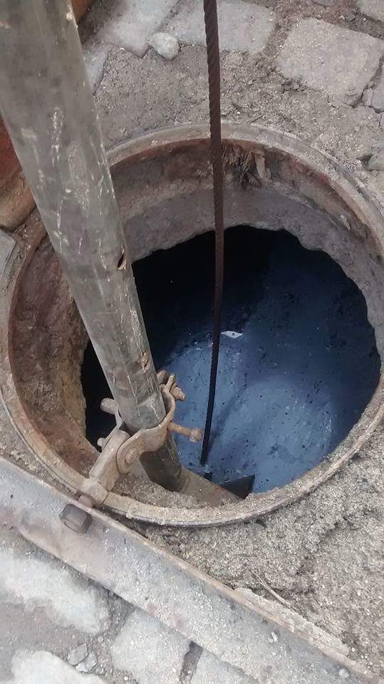 Foto 5: galeria da parte superior da rua, mostrando o nível da água (quase até a borda), mostrando que a água não escorre  entre uma galeria e outra, devido à obstrução com areia.