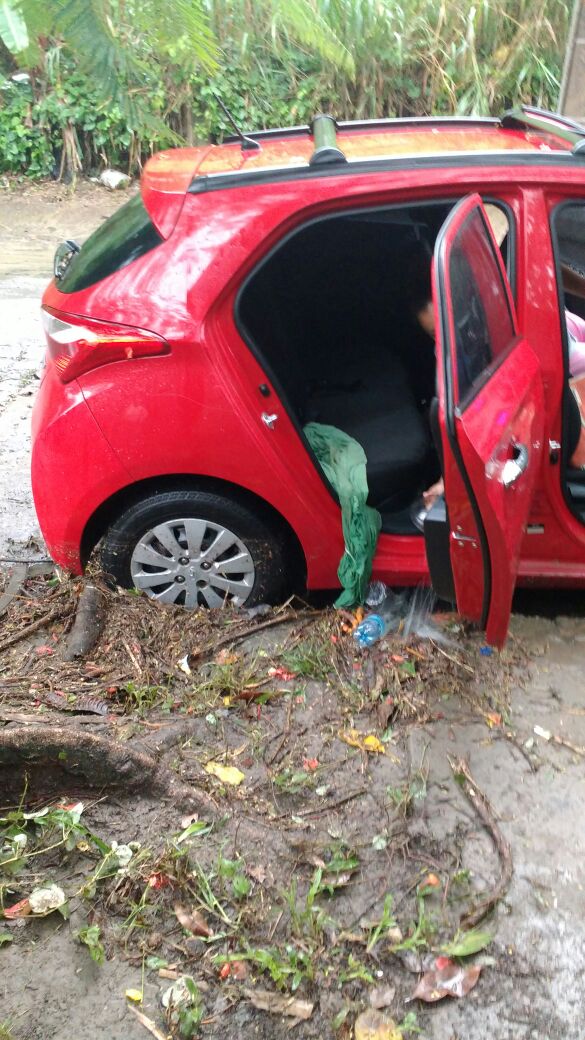 Com a descida do nível da enchente, a pessoa retira a água acumulada dentro do carro!